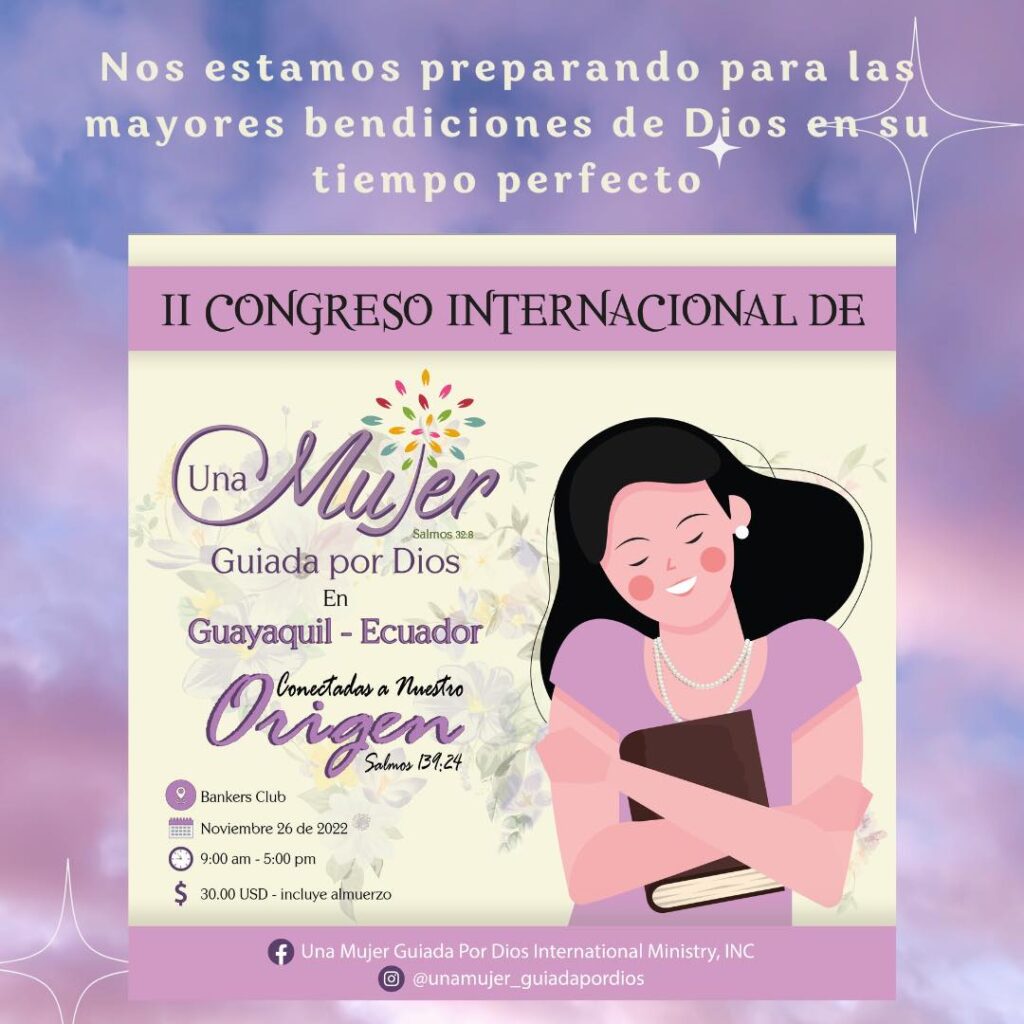II CONGRESO INTERNACIONAL DE UNA MUJER GUIADA POR DIOS EN GUAYAQUIL ECUADOR ESTE PR脫XIMO 26 DE NOVIEMBRE del 2022. Te esperamos, mujeres de diferentes partes del mundo 馃寧 estaremos reunidas en un mismo sentir.